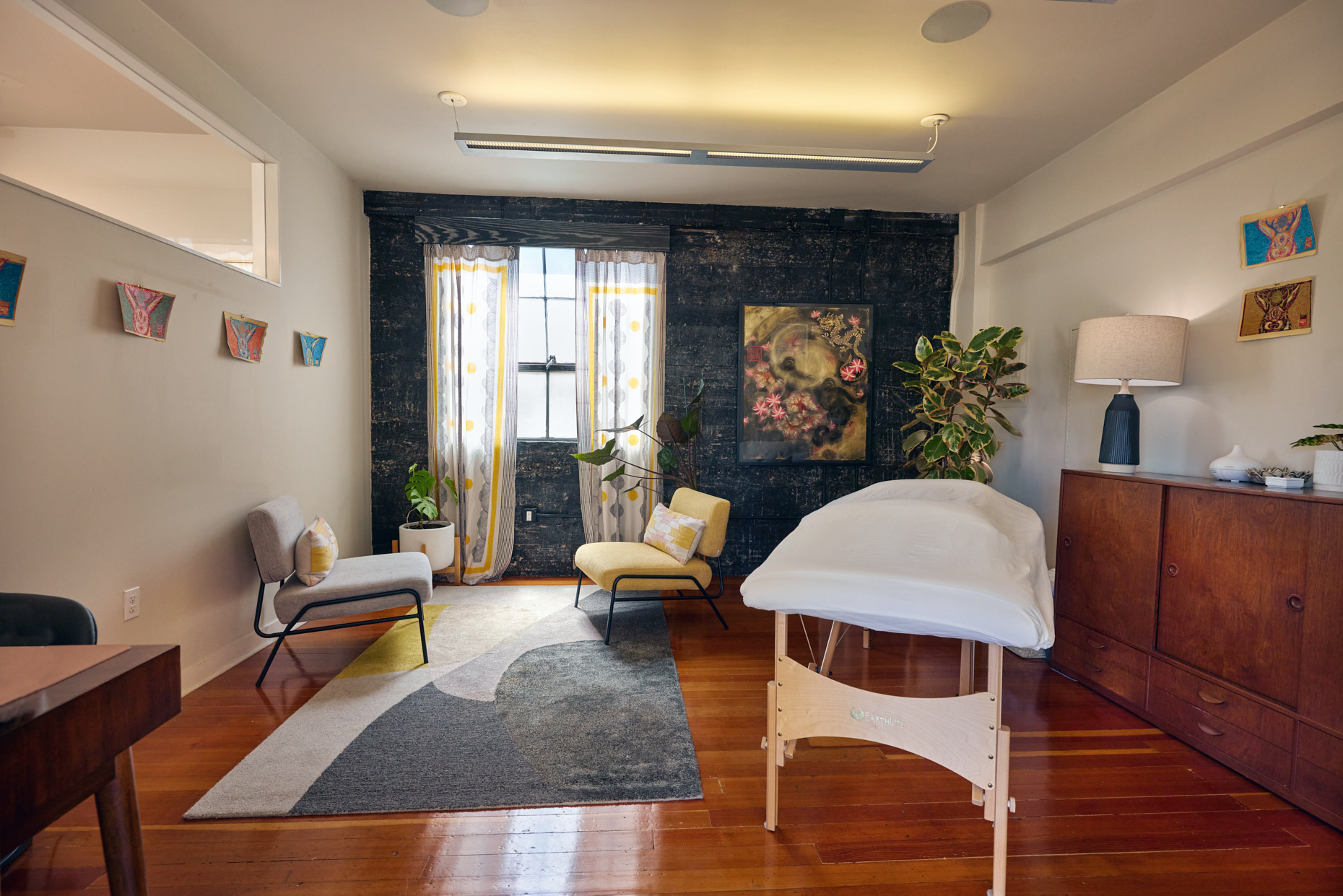 2 furnished offices approximately 14’x14’ with a massage table complete with table warmer and face cradle. Sheets included if you do not use oils.