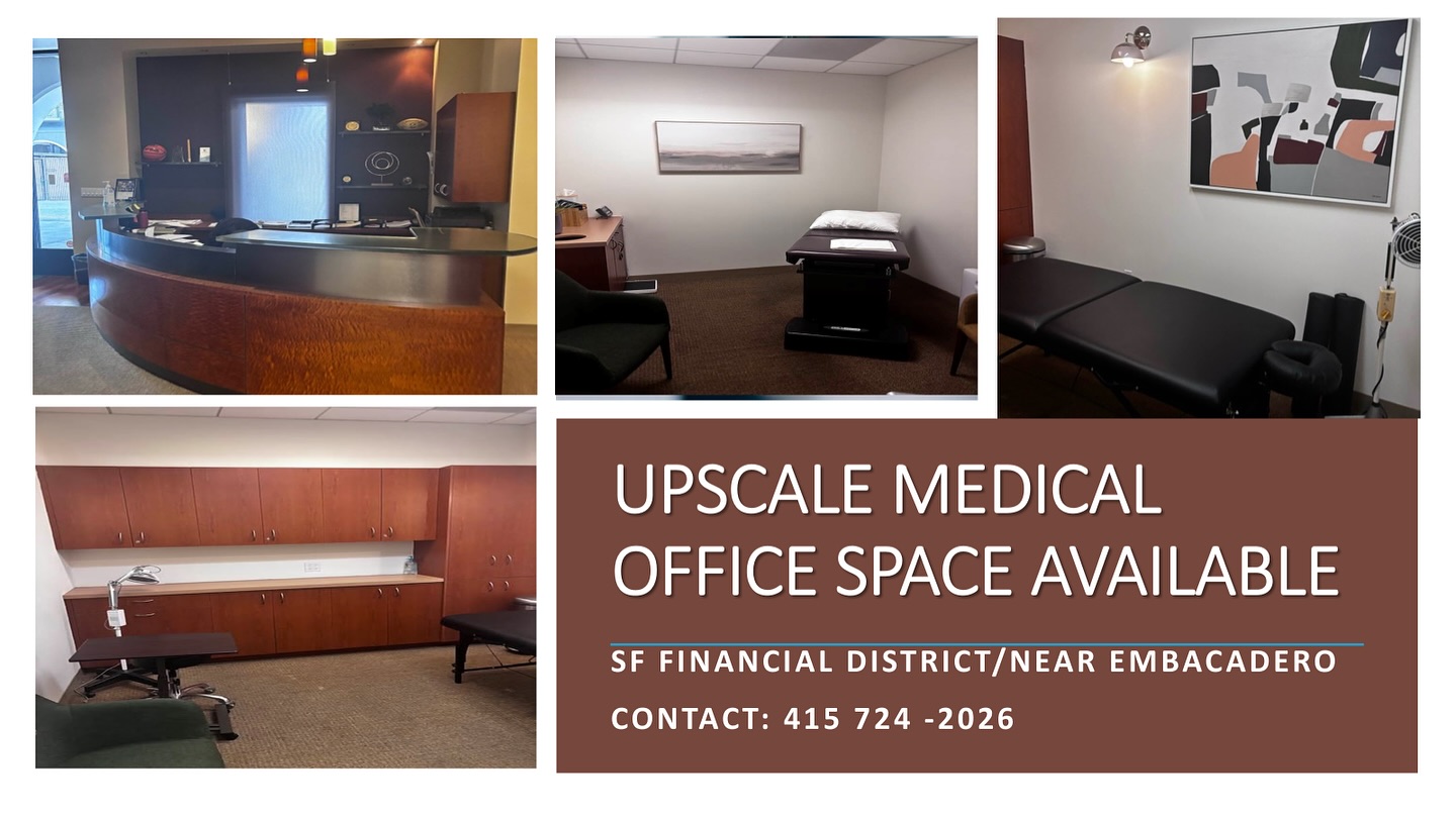 The location is a multispecialty medical and wellness facility. There are 3 wellness rooms available for hourly, daily, weekly and monthly usage. The rooms are aesthetically pleasing with ample treatment space and cabinetry. There is a shared office space available for charting, etc. The office space is upscale and located in the San Francisco Financial District near the Embarcadero. There is a reception desk and waiting area, onsite gym, kitchen and bathrooms in the facility. The office is on the street level ADA accessible with drive up access. Street and garage parking is available.